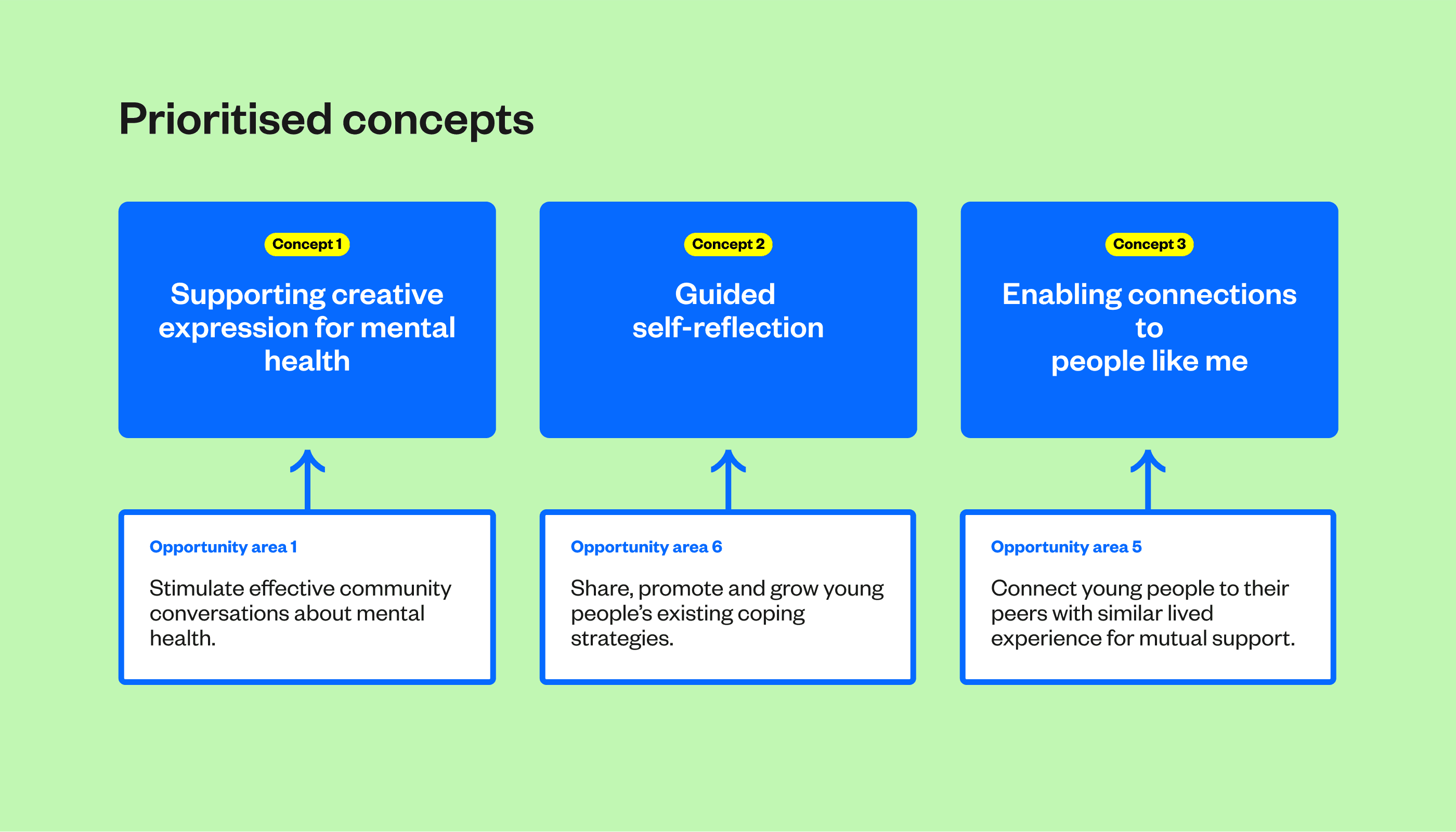 3. Ideation & Concept Development: During ideation, participants co-created solutions that addressed key opportunity areas, such as creating spaces for community conversations about mental health, connecting peers with similar experiences, and promoting creative expression as a coping mechanism. Design sprints further helped to refine these ideas. The prioritised concepts—creative expression, guided self-reflection, and peer support—responded to the identified needs of young people, allowing them to manage their mental health in more personal, relatable ways.
